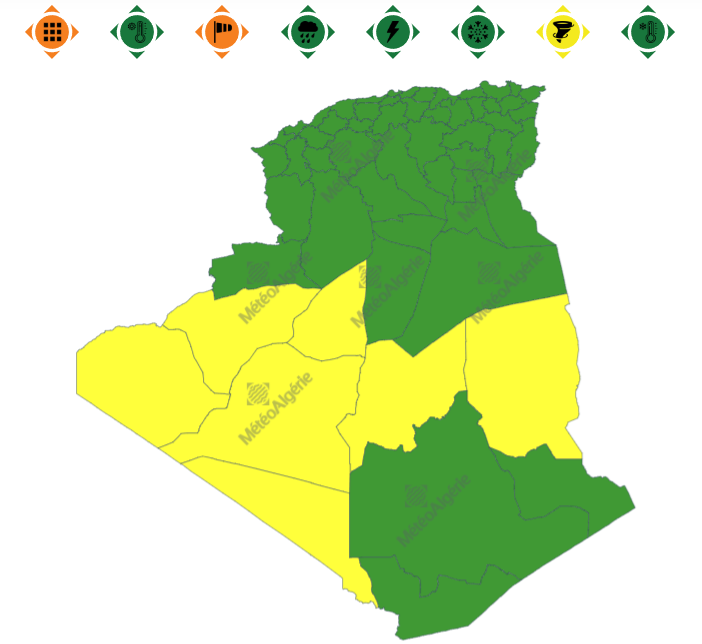 وحسب تنبيه للديوان الوطني للأرصاد الجوية من المستوى الأول باللون الأصفر على خريطة اليقظة، فإن الولايات المعنية بالزوابع هي: أدرار، برج باجي مختار، تيميمون، بني عباس، إيليزي، تيندوف، وعين صالح.