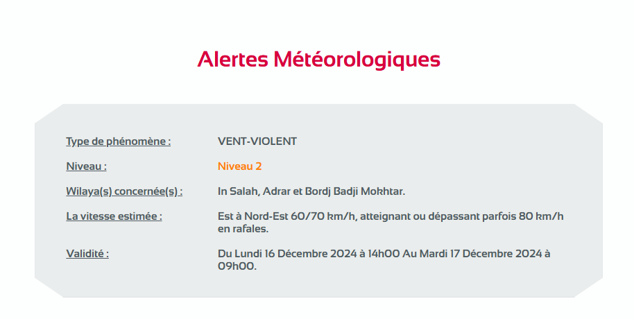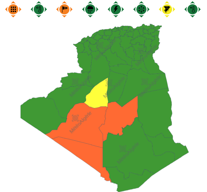 وحسب تنبيه للديوان الوطني للأرصاد الجوية من المستوى الثاني باللون البرتقالي على خريطة اليقظة، فإن الولايات المعنية بالرياح العاتية هي: عين صالح، أدرار وبرج باجي مختار.