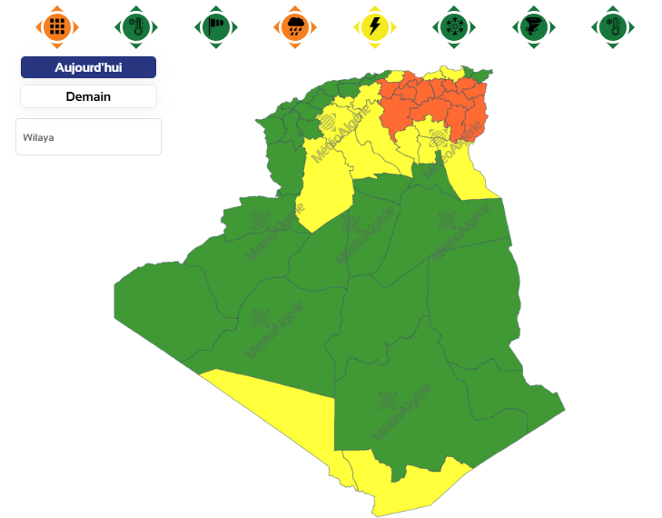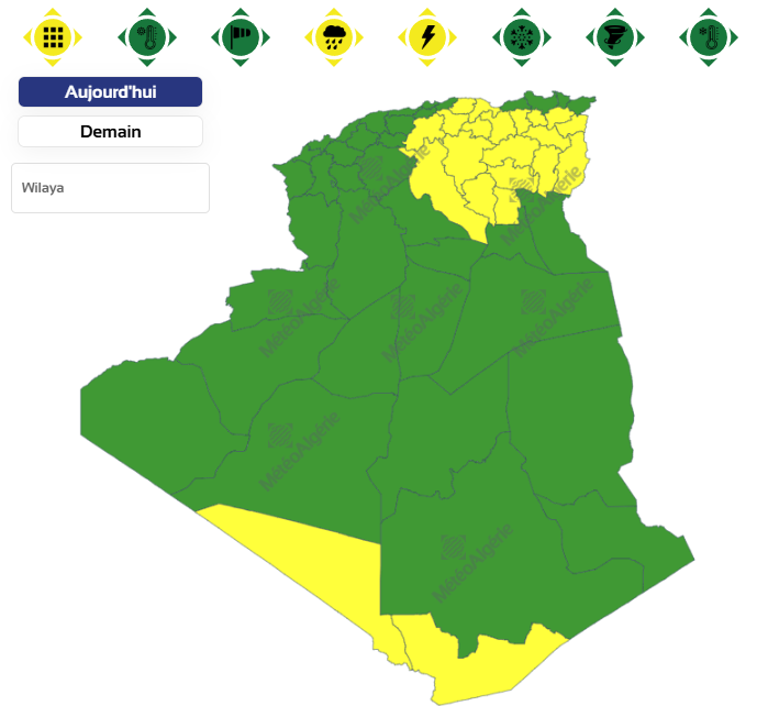 وحسب تنبيه للديوان الوطني للأرصاد الجوية من المستوى الأول باللون الأصفر على خريطة اليقظة، فإن الولايات المعنية بنشاط الخلايا الرعدية والأمطار من الساعة 12 زوالا من اليوم الأربعاء لغاية الساعة التاسعة مساءً هي: سوق أهراس، عين قزام، الأغواط، برج بوعريريج، بجاية، المسيلة، برج باجي مختار، ميلة، أم البواقي، تبسة، قالمة، تيزي وزو، باتنة، تندوف، سطيف، الجلفة، قسنطينة، المغير، جيجل، خنشلة، المدية، بسكرة، أدرار، البويرة، وأولاد جلال.