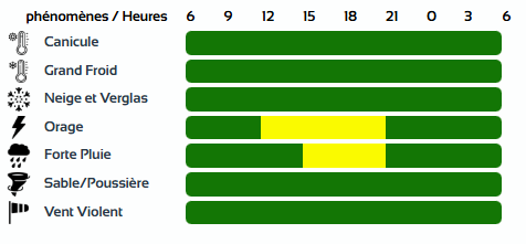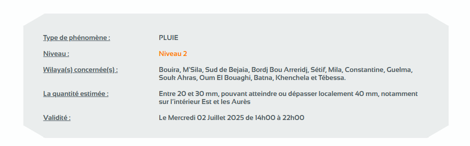 وحسب تنبيه للديوان الوطني للأرصاد الجوية من المستوى الثاني باللون البرتقالي على خريطة اليقظة، فإن الولايات المعنية بتساقط الأمطار التي تتراوح بين 20 ملم و30 ملم وتصل أحيانا أو تتجاوز الـ 40 ملم خاصة في المناطق الداخلية الشرقية ومنطقة الأوراس هي: البويرة، المسيلة، جنوب بجاية، برج بوعريريج، سطيف، ميلة، قسنطينة، قالمة، سوق أهراس، أم البواقي، باتنة، خنشلة، وتبسة.