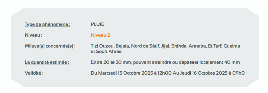 وحسب تنبيه للديوان الوطني للأرصاد الجوية من المستوى الثاني باللون البرتقالي على خريطة اليقظة، فإن الولايات المعنية بتساقط الأمطار التي تتراوح بين 20 ملم و30 ملم وتصل أحيانا أو تتجاوز محليا الـ 40 ملم من الساعة 12 زوالا من اليوم الأربعاء إلى غاية التاسعة صباحا من يوم غد الخميس هي: تيزي وزو، بجاية، شمال سطيف، جيجل، سكيكدة، عنابة، الطارف، قالمة وسوق أهراس.