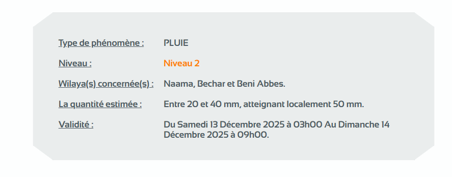وحسب تنبيه للديوان الوطني للأرصاد الجوية من المستوى الثاني باللون البرتقالي على خريطة اليقظة، فإن الولايات المعنية بتساقط الأمطار التي تتراوح بين 20 ملم و40 ملم وقد تصل أو تتجاوز محليا الـ 50 ملم من الساعة الثالثة صباحا من اليوم السبت إلى غاية الساعة التاسعة صباحا من يوم غد الأحد هي: النعامة، بشار وبني عباس.
