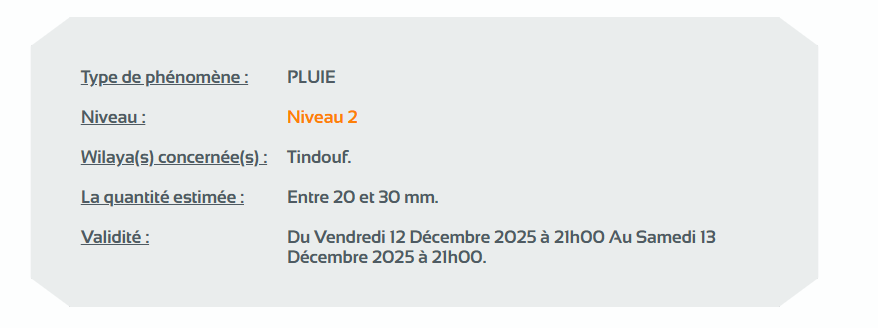 وحسب تنبيه آخر للديوان من المستوى الثاني باللون البرتقالي على خريطة اليقظة، ستتساقط الأمطار التي تتراوح بين 20 ملم و30 ملم إلى غاية الساعة التاسعة مساءً من اليوم السبت على ولاية: تندوف.