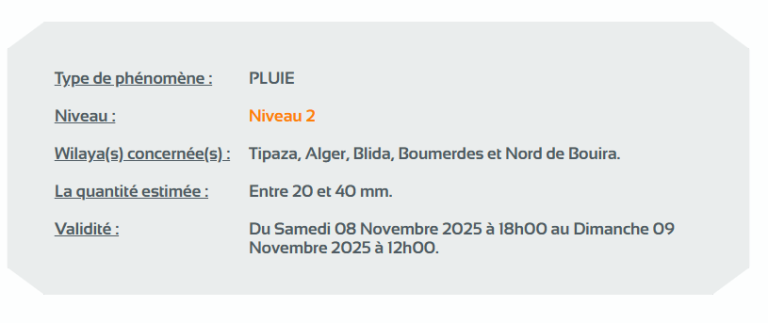 وحسب تنبيه آخر للديوان من المستوى الثاني باللون البرتقالي على خريطة اليقظة، ستتساقط الأمطار التي تتراوح بين 20 ملم و40 ملم لغاية الساعة 12 منتصف النهار من اليوم الأحد على ولايات: تيبازة، الجزائر العاصمة، البليدة، بومرداس وشمال البويرة.