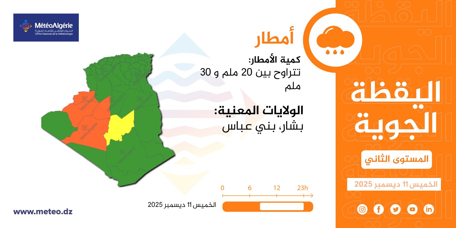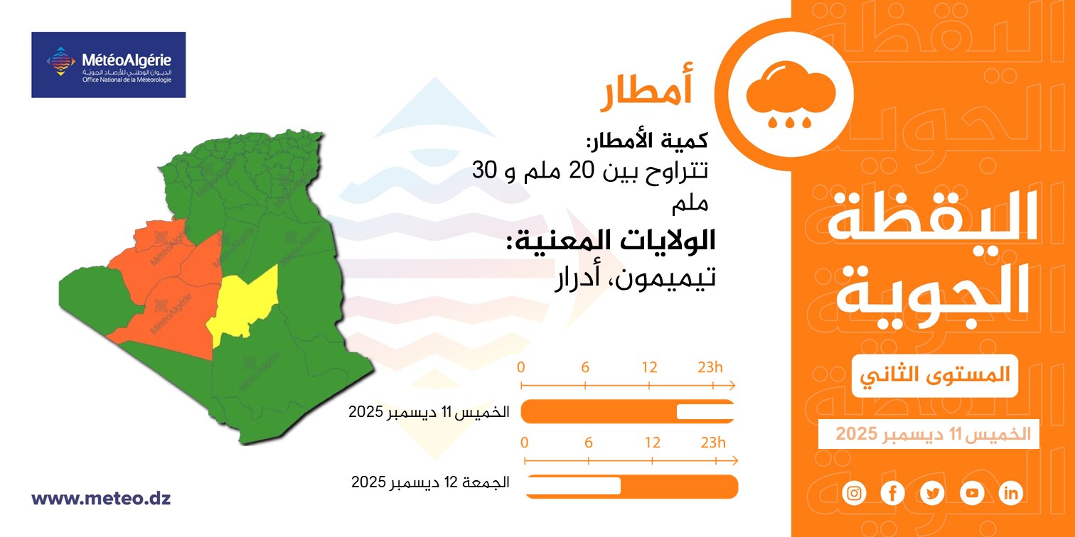 وحسب تنبيه للديوان الوطني للأرصاد الجوية من المستوى الثاني باللون البرتقالي على خريطة اليقظة، فإن الولايات المعنية بتساقط الأمطار التي تتراوح بين 20 ملم و30 ملم من الساعة 12 ليلا من يوم الخميس إلى غاية الساعة 11 ليلا من يوم الجمعة هي: بشار، بني عباس، تيميمون، أدرار.