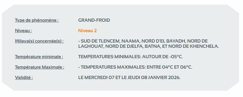 وحسب تنبيه للديوان الوطني للأرصاد الجوية من المستوى الثاني باللون البرتقالي على خريطة اليقظة، فإن الولايات المعنية بموجة البرد التي تصل إلى 5- درجات تحت الصفر هي:  جنوب تلمسان، النعامة، شمال البيض، شمال الأغواط، شمال الجلفة، باتنة، وشمال خنشلة.