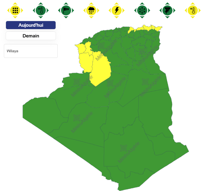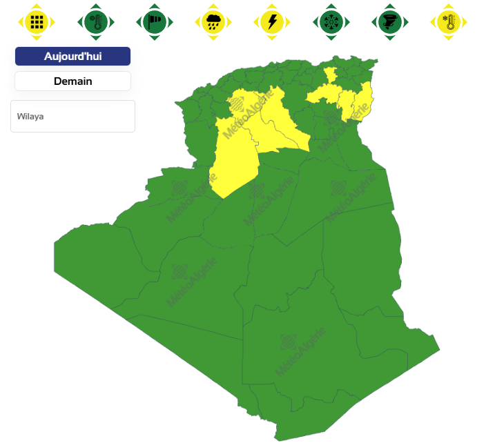كما نبه الديوان في نشرية أخرى من المستوى الأول باللون الصفر على خريطة اليقظة، بتساقط أمطار رعدية متبوعة بانخفاض شديد في درجة الحرارة بداية من الساعة الثالثة بعد الزوال من اليوم الأربعاء إلى غاية الساعة 12 ليلا من نفس اليوم الأربعاء على ولايات: الطارف، عنابة، سكيكدة، جيجل، بجاية، ميلة، تبسة، خنشلة، باتنة، الجلفة، الأغواط، البيض، تيارت، سيدي بلعباس، تلمسان، النعامة وسوق أهراس.