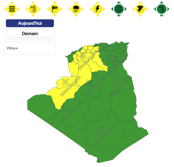 وحسب تنبيه للديوان الوطني للأرصاد الجوية من المستوى الأول باللون الأصفر على خريطة اليقظة، فإن الولايات المعنية بنشاط الخلايا الرعدية والأمطار بداية من 12 ظُهرا من اليوم الخميس لغاية الساعة السادسة من يوم غد الجمعة هي: تيبازة، الشلف، عين الدفلى، المدية، تيسمسيلت، غيليزان، الجلفة، تيارت، معسكر، الأغواط، البيض، سعيدة، سيدي بلعباس، النعامة، بشار وبني عباس.