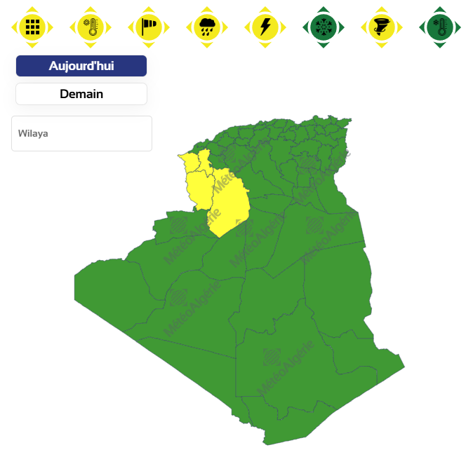 وحسب ذات التنبيه، ستجتاح الرياح العاتية المتبوعة بالزوابع الرملية بداية من الساعة 12 ظُهرا من اليوم الخميس لغاية الساعة التاسعة مساءً من نفس اليوم على ولايات: سيدي بلعباس، تلمسان، البيض والنعامة.