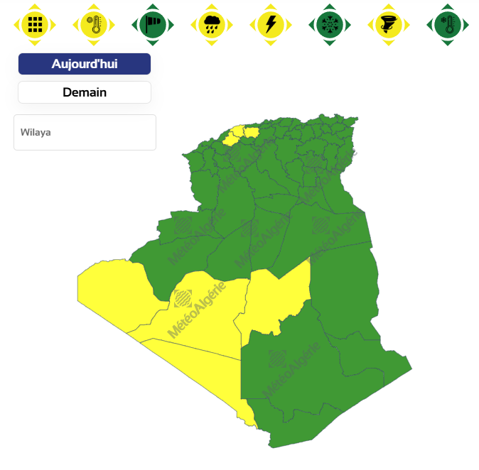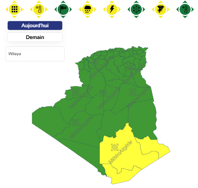 وحسب تحذير للديوان الوطني للأرصاد الجوية من المستوى الثاني باللون البرتقالي على خريطة اليقظة، فإن الولايات المعنية بموجة الحر من الساعة السادسة صباحًا من اليوم الثلاثاء إلى غاية الساعة 12 ليلا من نفس اليوم هي: عين الدفلى، الشلف، غيليزان، عين صالح، أدرار، برج باجي مختار وتيندوف.