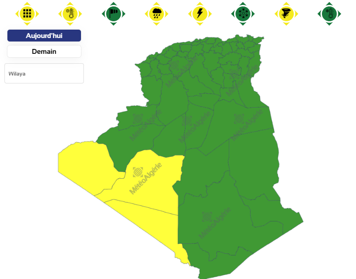 وحسب تنبيه للديوان الوطني للأرصاد الجوية من المستوى الأول باللون الأصفر على خريطة اليقظة، فإن الولايات المعنية بموجة الحر من الساعة السادسة صباحًا من اليوم الإثنين إلى غاية الساعة السادسة صباحا من يوم غد الثلاثاء هي: تيندوف، أدرار وبرج باجي مختار.
