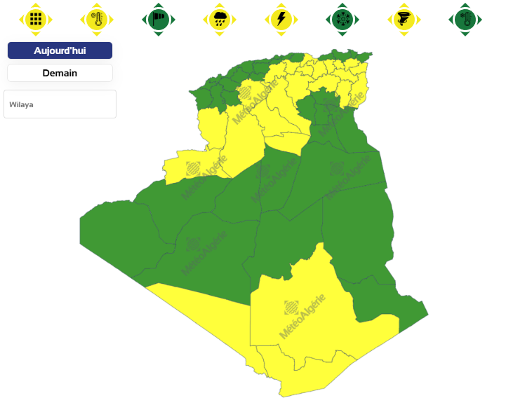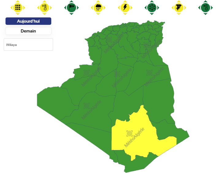 وحسب تنبيه آخر للديوان الوطني للأرصاد الجوية من المستوى الأول باللون الأصفر على خريطة اليقظة، فإن الولايات المعنية بنشاط الخلايا الرعدية والأمطار من الساعة 12 زوالا إلى غاية الساعة 12 ليلا من اليوم الإثنين هي: سوق أهراس، ورقلة، عين قزام، الأغواط، برج بو عريرج، بجاية، غرداية، تقرت، المسيلة، برج باجي مختار، تيارت، ميلة، تمنراست، أم البواقي، تبسة، قالمة، عين صالح، باتنة، تندوف، سطيف، جانت، الجلفة، قسنطينة، البيض، المغير، جيجل، خنشلة، المدية، أدرار، النعامة، البويرة وبشار.