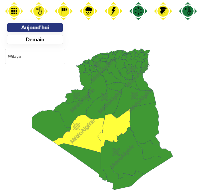 وحسب ذات التنبيه ستجتاح الرياح القوية والزوابع الرملية ولايتي برج باجي مختار وعين قزام من الساعة 12 بعد الزوال من اليوم الأربعاء إلى غاية الساعة 12 ليلا من نفس اليوم.