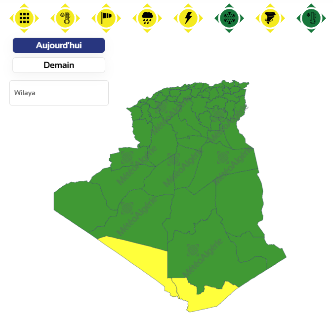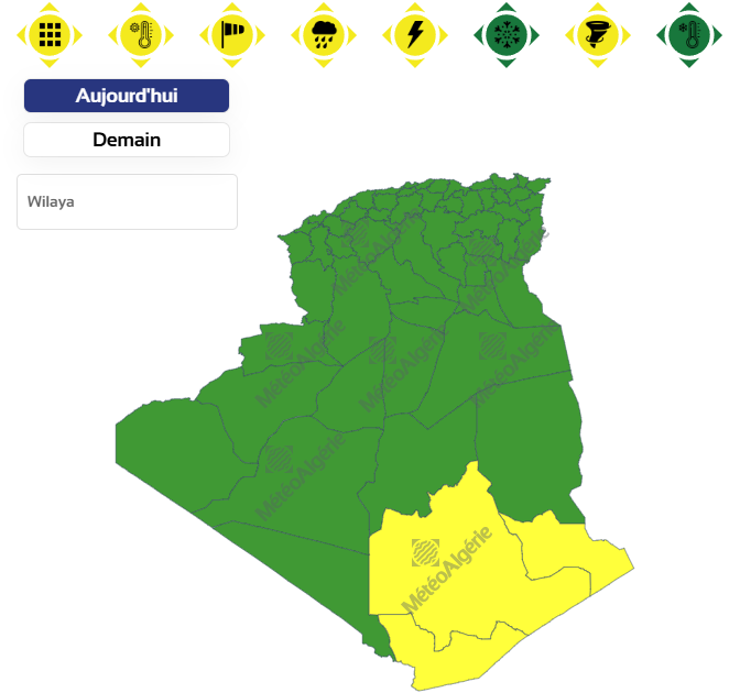 وحسب تنبيه للديوان الوطني للأرصاد الجوية من المستوى الأول باللون الأصفر على خريطة اليقظة، فإن الولايات المعنية بموجة الحر من الساعة السادسة صباحًا من اليوم الأربعاء إلى غاية الساعة السادسة صباحا من يوم غد الخميس هي: عين صالح وأدرار.