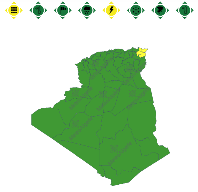 وحسب تنبيه للديوان الوطني للأرصاد الجوية من المستوى الأول باللون الأصفر على خريطة اليقظة، فإن الولايات المعنية بنشاط الخلايا الرعدية هي: عنابة، الطارف، قالمة و سوق أهراس.