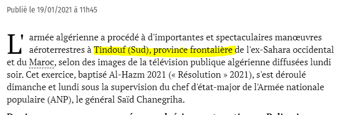 وجاء في الرد: استغربت كثيرا لما ورد في المقال الذي نشرته النسخة الرقمية لصحيفتكم (لوبوان أفريك مع وكالة الأنباء الفرنسية) بتاريخ 19 يناير على الساعة 11:45 تحت عنوان (مناورات جزائرية في الصحراء بالقرب من الحدود مع المغرب) والذي يستند إلى برقية لوكالة الأنباء الفرنسية”.