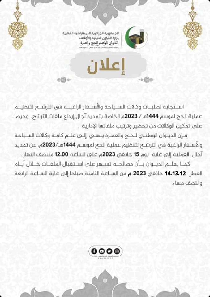 أعلن الديوان الوطني للحج والعمرة عن تمديد آجال إيداع ملفات ترشح الوكالات السياحية لتنظيم عملية الحج لموسم 2023.