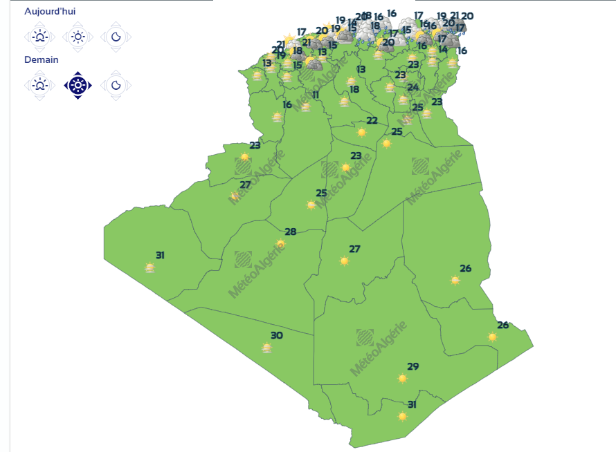 وما بين 11 و17 على الولايات الداخلية وجنوبا تتراوح درجات الحرارة ما بين 22 و29 درجة مئوية.