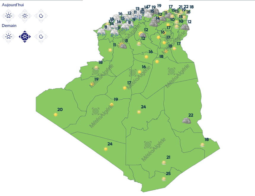 وأفادت التوقعات أن الأمطار ستخص ولايات: سعيدة، تلمسان، وهران، مستغانم، سيدي بلعباس، معسكر، غليزان، البليدة، الشلف، الجزائر العاصمة، المدية وتيارت.