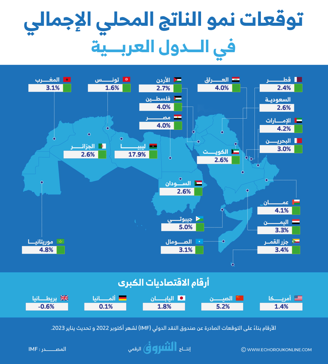 توقعات نمو الناتج المحلي الإجمالي في الدول العربية سنة 2023 حسب صندوق النقد الدولي (IMF)