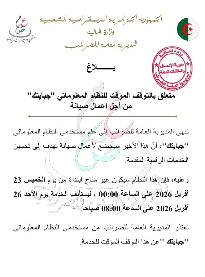 أعلنت المديرية العامة للضرائب عن توقف مؤقت للنظام المعلوماتي “جبايتك”، بسبب أعمال صيانة بهدف تحسين الخدمة الرقمية.