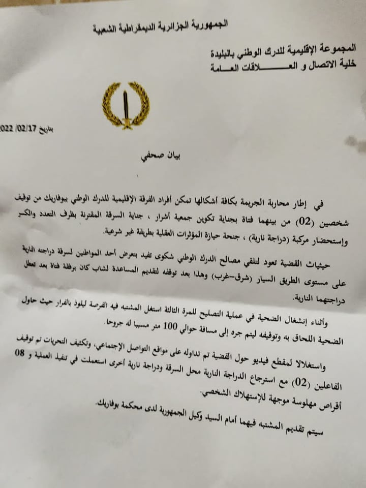 وأضاف أن حيثيات القضية تعود لتلقي مصالح الدرك شكوى تفيد بتعرض أحد المواطنين لسرقة دراجته النارية على مستوى الطريق السيار (شرق-غرب) وهذا بعد توقفه لتقديم المساعدة لشاب كان برفقة فتاة بعد تعطل دراجتهما النارية.