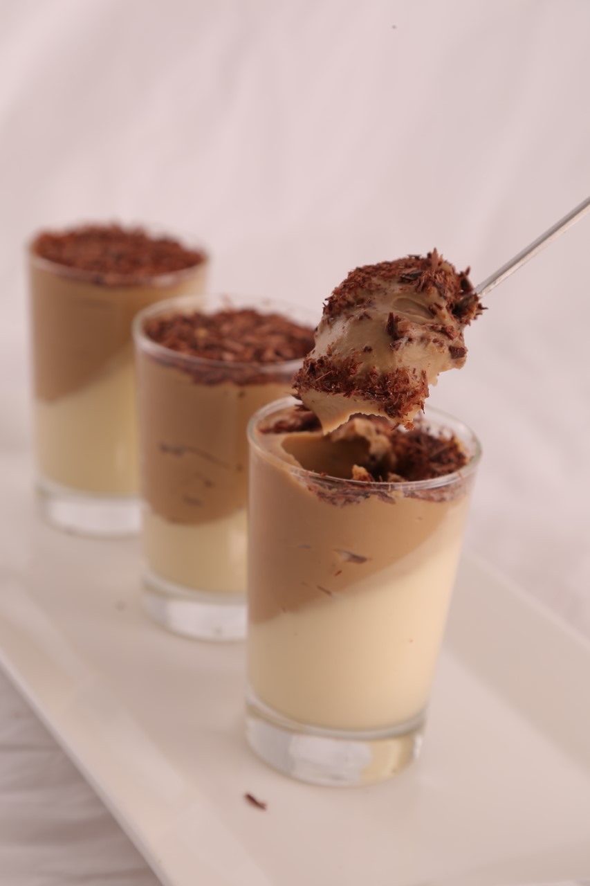 في قدر نضع الحليب ونضيف القشدة السائلة والسكر والمايزينة والقهوة السائلة وحبة البيض المخفوقة ونخلط جميع المقادير جيدا، ثم نضع الخليط فوق نار هادئة ونحرك باستمرار حتى نتحصل على كريمة القهوة، نترك الكريمة تبرد قليلا ثم نفرغها في القوالب الموضوعة بشكل مائل ثم ندخلها الثلاجة لمدة ساعتين، في ذلك الوقت نحضر كريمة الفانيليا بنفس الطريقة، في قدر نضع الحليب والقشدة السائلة والسكر والمايزينة وحبة البيض المخفوقة ونحرك جميع المقادير جيدا، ثم نضع الخليط فوق نار هادئة ونحرك باستمرار حتى نتحصل على كريمة الفانيليا، نتركها تبرد قليلا، ثم نخرج قوالب كريمة القهوة من الثلاجة ونسكب فيها كريمة الفانيليا ثم ندخلها الثلاجة كي تبرد ونزين حسب الرغبة ، كما يمكننا البدأ بكريمة الفانيليا ثن نضيف فوقها كريمة القهوة بنفس الطريقة (أنظري الصورة).