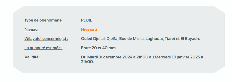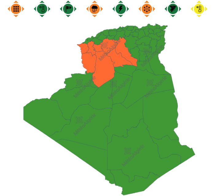 وفي نشرية أخرى، نبه الديوان الوطني من ستساقط أمطار تتراوح بين 20 و40 ملم على ولايات: أولاد جلال، الجلفة، جنوب المسيلة، الأغواط، تيارت والبيض بدايةً من الساعة التاسعة ليلا من يوم أمس الثلاثاء لغاية الساعة التاسعة مساءً من اليوم الأربعاء.