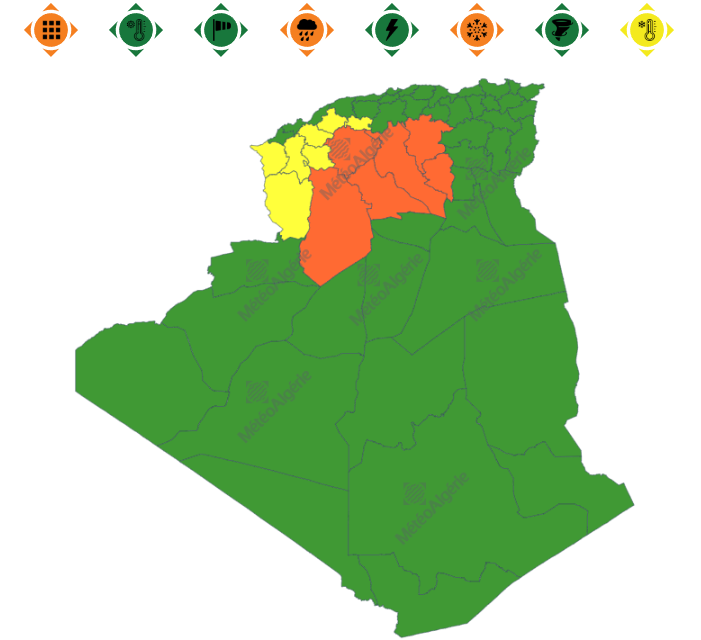 وحسب تنبيه آخر من المستوى الأول باللون الأصفر على خريطة اليقظة فإن الولايات المعنية بالبرودة الشديدة هي: النعامة، البيض، السعيدة، تيارت والجلفة.