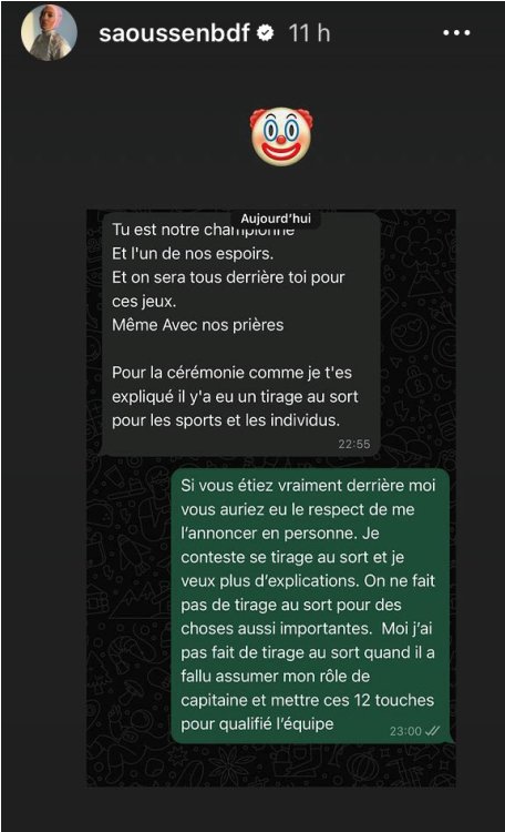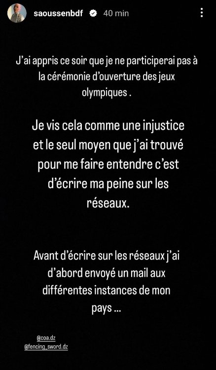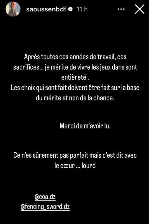 وأضافت تقول إنها تمقت هذا النّوع من الردود “السّمجة”، وكان من الأجدر الاتّصال بها وإخبارها بِالأمر. مُطالبة أصحاب القرعة (اللجنة الأولمبية الجزائرية والاتحادية الجزائرية للمبارزة) بِتقديم توضيحات أكثر.