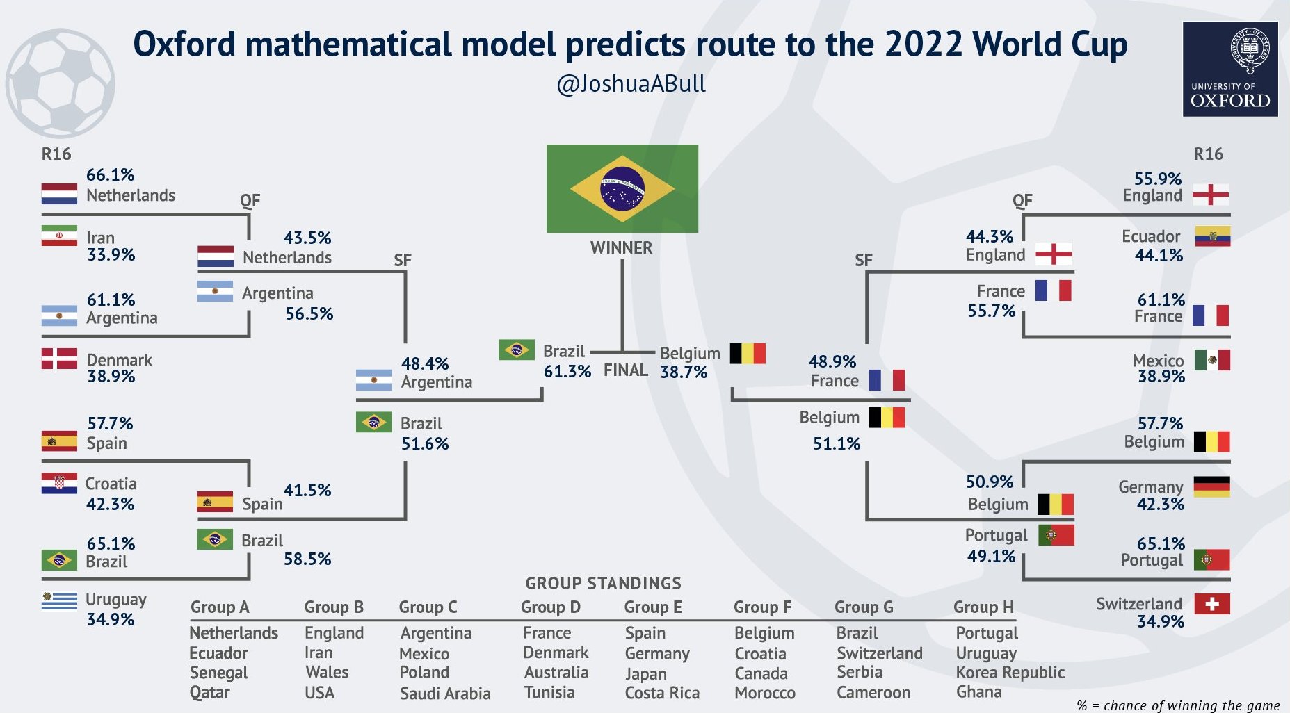 وكان الدكتور جوشوا بول – الذي ينتسب إلى جامعة أوكسفورد – قد نشر في تاريخ سابق توقّعات بِشأن مقابلات منافسة كأس العالم 2022، مثل ترتيب المنتخبات في أفواجها، والنتائج من ثمن النهائي إلى المباراة الختامية (الجدول المُدرج أدناه).