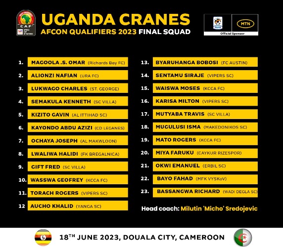 وقال اتحاد الكرة الأوغندي إن اللائحة تقلّصت، بعد أن “غربل” التقني سيردويفيتش قائمة مُوسّعة، بِواسطة تربّص انْتُظم داخل القواعد في العشرة أيّام الماضية (الصّورة المُدرجة أعلاه).