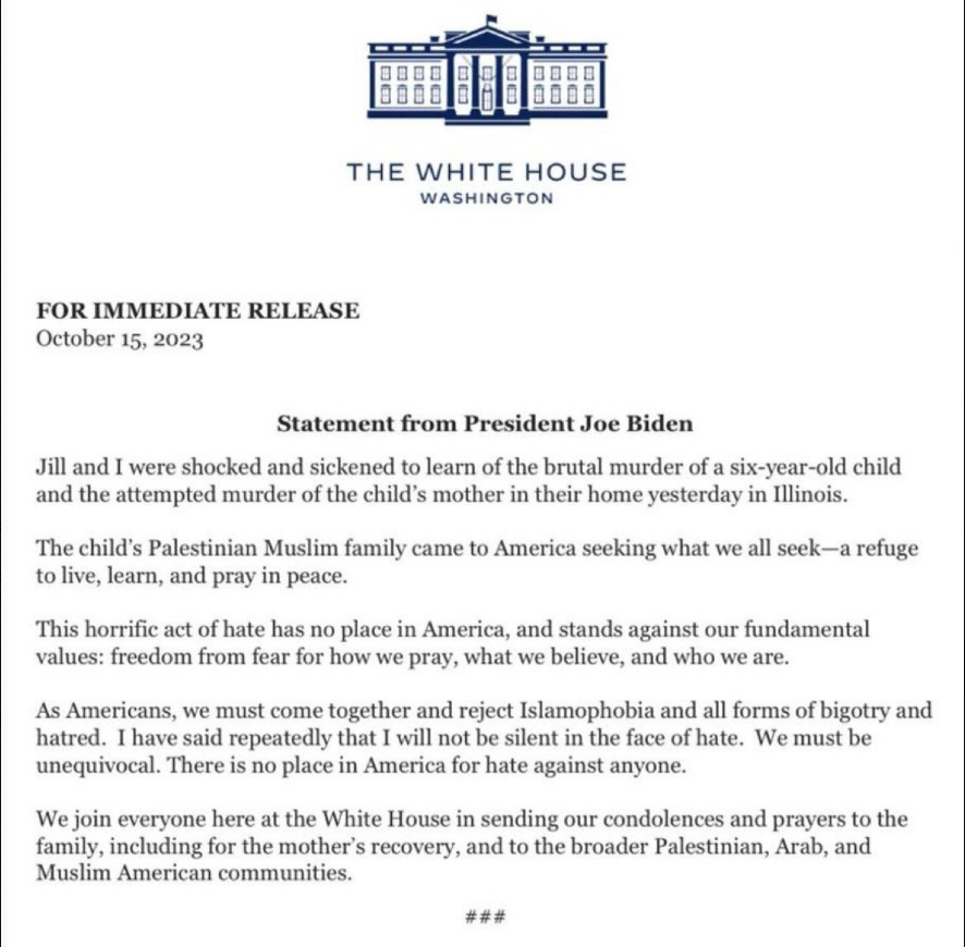 وأضاف بايدن: “عائلة الطفل الفلسطينية المسلمة قدمت إلى أميركا بحثا عما نسعى إليه، وهو ملجأ للعيش والتعلم والعبادة بأمان”، وتابع “يجب علينا كأميركيين أن نتحد ونرفض الإسلاموفوبيا وجميع أشكال التعصب والكراهية”.