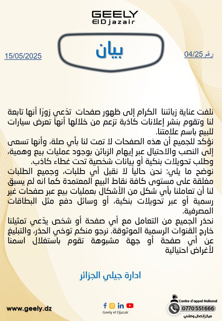 ودعت إدارة الشركة الزبائن إلى عدم التعامل مع أي جهة أو شخص خارج القنوات الرسمية الموثوقة، مطالبة بتوخي الحذر والتبليغ عن أي صفحة أو طرف مشبوه يستغل اسم جيلي الجزائر لأغراض احتيالية.
