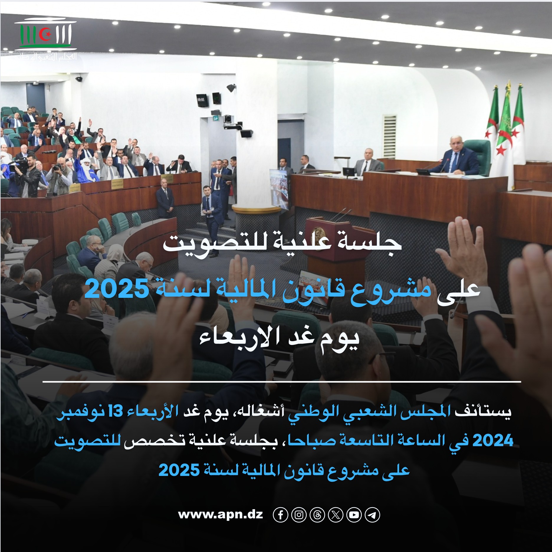 يعقد المجلس الشعبي الوطني اليوم الأربعاء، ابتداءً من الساعة التاسعة صباحًا، جلسة علنية للتصويت على مشروع قانون المالية لسنة 2025، حسب ما أفاد به بيان صادر عن المجلس.