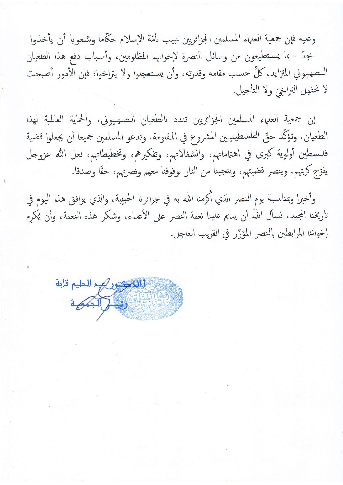 وبمناسبة يوم النصر الذي تحتفل به الجزائر، دعت الجمعية الله أن يديم على الجزائر نعمة الحرية والانتصار، وأن يمنّ على الفلسطينيين بالنصر العاجل على الاحتلال.