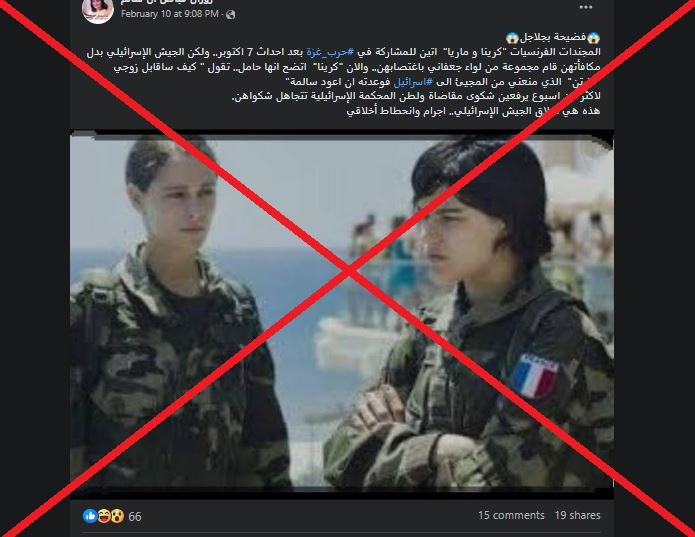 تظهر في الصورة التي اجتاحت الشبكات امرأتان ترتديان بزة عسكرية عليها العلم الفرنسي، وجاء في التعليق المرافق لها: “المجندات الفرنسيات أتين للمشاركة في حرب غزة بعد أحداث 7 أكتوبر”.