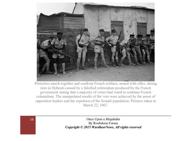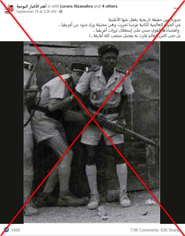 مئات آلاف التفاعلات حصدتها صورة على مواقع التواصل الاجتماعي قال ناشروها أنها لجنديّ فرنسيّ خلال الحرب العالميّة وهو يختبئ وراء جنديّ إفريقي. إلا أن الصورة المجتزأة منشورة على أنها ملتقطة في الحقيقة أثناء احتجاج شعبيّ ضدّ فرنسا في جيبوتي بعد أكثر من عشرين عاماً على نهاية الحرب العالميّة الثانية.