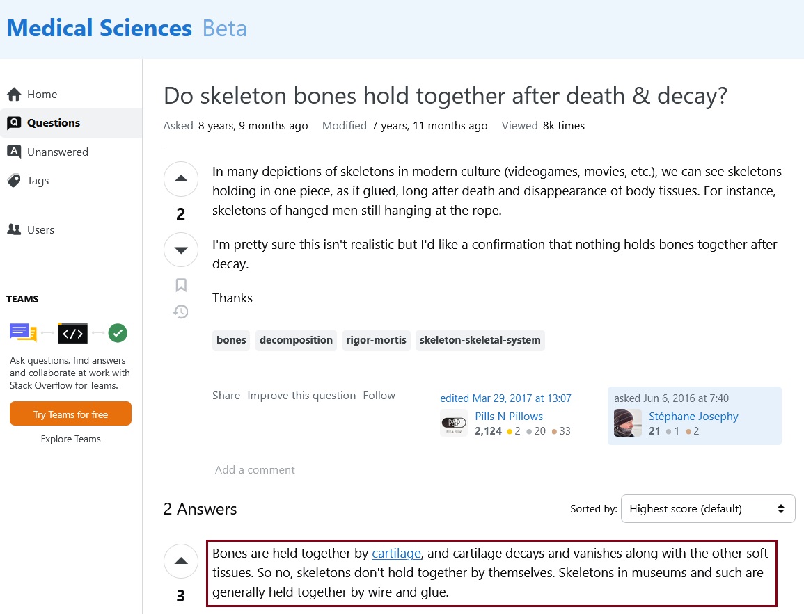ووفقًا لمنصة “medical sciences” المتخصصة في تبادل المعلومات الطبية، فإن العظام تظل ثابتة في الجسم بواسطة الغضاريف، لكن هذه الأخيرة تتحلل بعد الوفاة، مما يؤدي إلى تفكك الهيكل العظمي. وعليه فإن الصورة لا تتوافق مع الحقائق العلمية، حيث يتم تثبيت الهياكل العظمية المعروضة في المتاحف باستخدام الغراء أو الأسلاك.