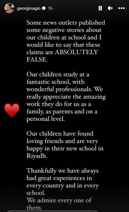 وكتبت جورجينا، عبر “ستوري” حسابها على إنستغرام: “بعض التقارير نشرت أخبارا سلبية عن وضع أبنائي في المدرسة، أود أن أنوه أنها أخبار غير صحيحة بالمرة، أطفالنا يدرسون في مدرسة رائعة”.