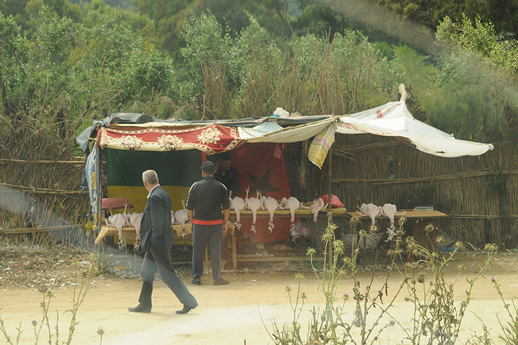 العشرات من الطاولات، والكثير من المحلات، ولكن الطلبات كثيرة، مما يجعل لحوم الديك الرومي لا تبقى لساعات طويلة تحت الشمس، فذبح الديوك لا يتوقف، حيث الشاحنات الصغيرة المملوءة بهذه الطيور متوقفة ولا ينتهي الطلب عليها.