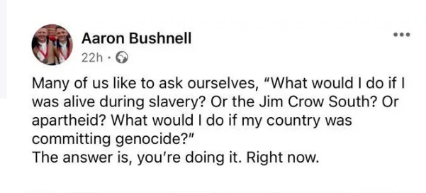 وتداول ناشطون صورة لآخر منشور كتبه بوشنل عبر حسابه على فيسبوك، والذي قال فيه: “يحب الكثير منا أن نسأل أنفسنا: ماذا كنت سأفعل لو كنت على قيد الحياة أثناء العبودية؟ أو جيم كرو الجنوب؟”.