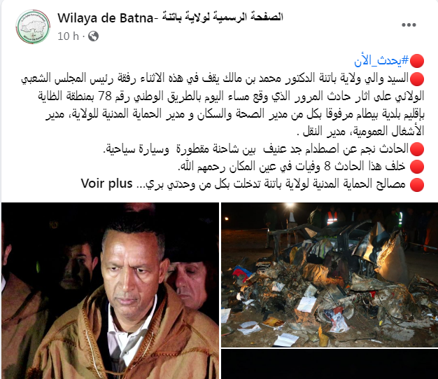 وتنقل، الجمعة ليلا، إلى مكان الحادث والي باتنة محمد بن مالك مرفوقا بكل من مدير الصحة والسكان و مدير الحماية المدنية للولاية، مدير الأشغال العمومية، مدير النقل للوقوف على أثار الحادث مقدما تعازيه لأسرة الضحايا.