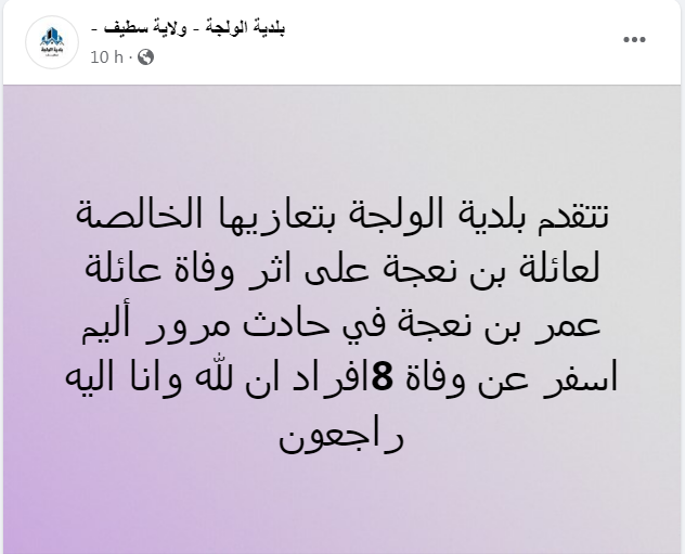 وكتبت بلدية الولجة التابعة لدائرة بئر العرش بولاية سطيف على صفحتها الرسمية عبر فيسبوك تعزية لعائلة الضحايا المتكونة من الأب والأم وشقيقتها و5 أطفال.