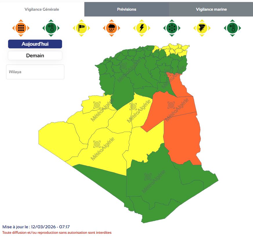 وأشار الديوان في تنبيه من المستوى الأول باللون الأصفر إلى تساقط أمطار في كل من ولايات: الطارف، عنابة، سكيكدة، جيجل، بجاية، سوق أهراس، قالمة، قسنطينة وميلة، الوادي، ورقلة وإليزي رعود.