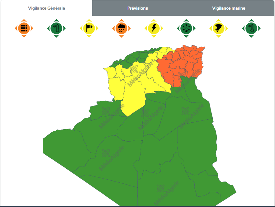 وحسب تنبيه من المستوى الأول لديوان الأرصاد الجوية فإن الولايات المعنية بالنشرية هي: سيدي بلعباس، الأغواط، بجاية، تيارت، تيزي وزو، الجلفة، تلمسان، المدية، السعيدة والبويرة، النعامة والبيض.