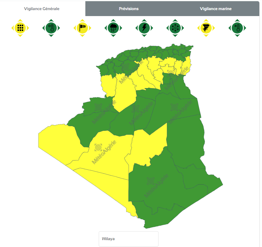 وحسب تنبيه من المستوى الأول باللون الأصفر، فإن الولايات المعنية بالنشرية هي: الأغواط، المسيلة، برج باجي مختار، تبسة، عين صالح، باتنة، تندوف، الجلفة، البيض، خنشلة، بسكرة، أدرار، نعامة وولاد جلال.