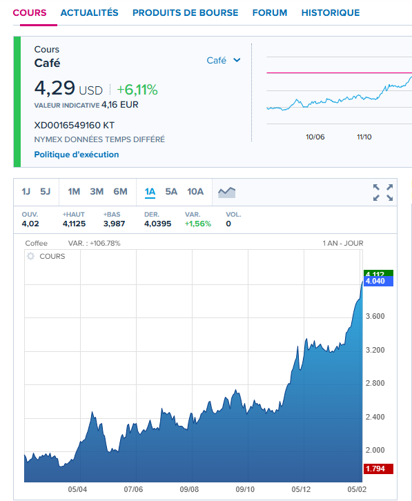 وتسود حالة من الذعر لدى المضاربين وتجارة البُن في العالم، نظرا للتغيرات الحاصلة في السوق الذي لم يعرف استقرارا وانفخاضا في الأسعار منذ سنة، ويُرجع المضاربون هذا المنحى التصاعدي في الأسعار الى محدودية توافر القهوة، وكذلك قلة المخزون في البرازيل التي تنتج حوالي نصف قهوة أرابيكا.