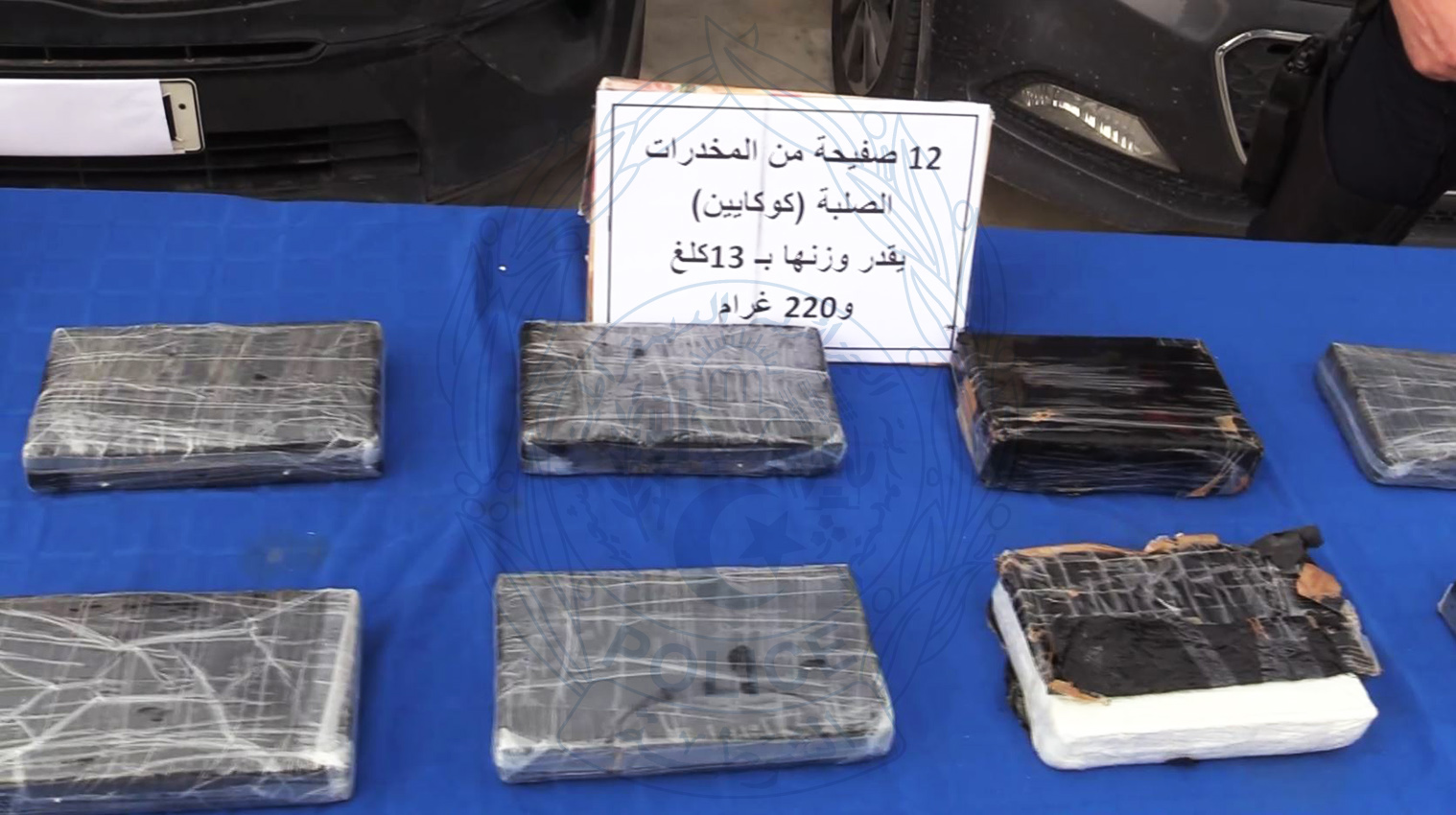 حيث ضبط في حوزة المتورطين 13 كلغ و220 غرام من الكوكايين، كانت مخبأة بإحكام في واقي الصدمات الخلفي لمركبة مسروقة، استعملت في نقل المخدرات.