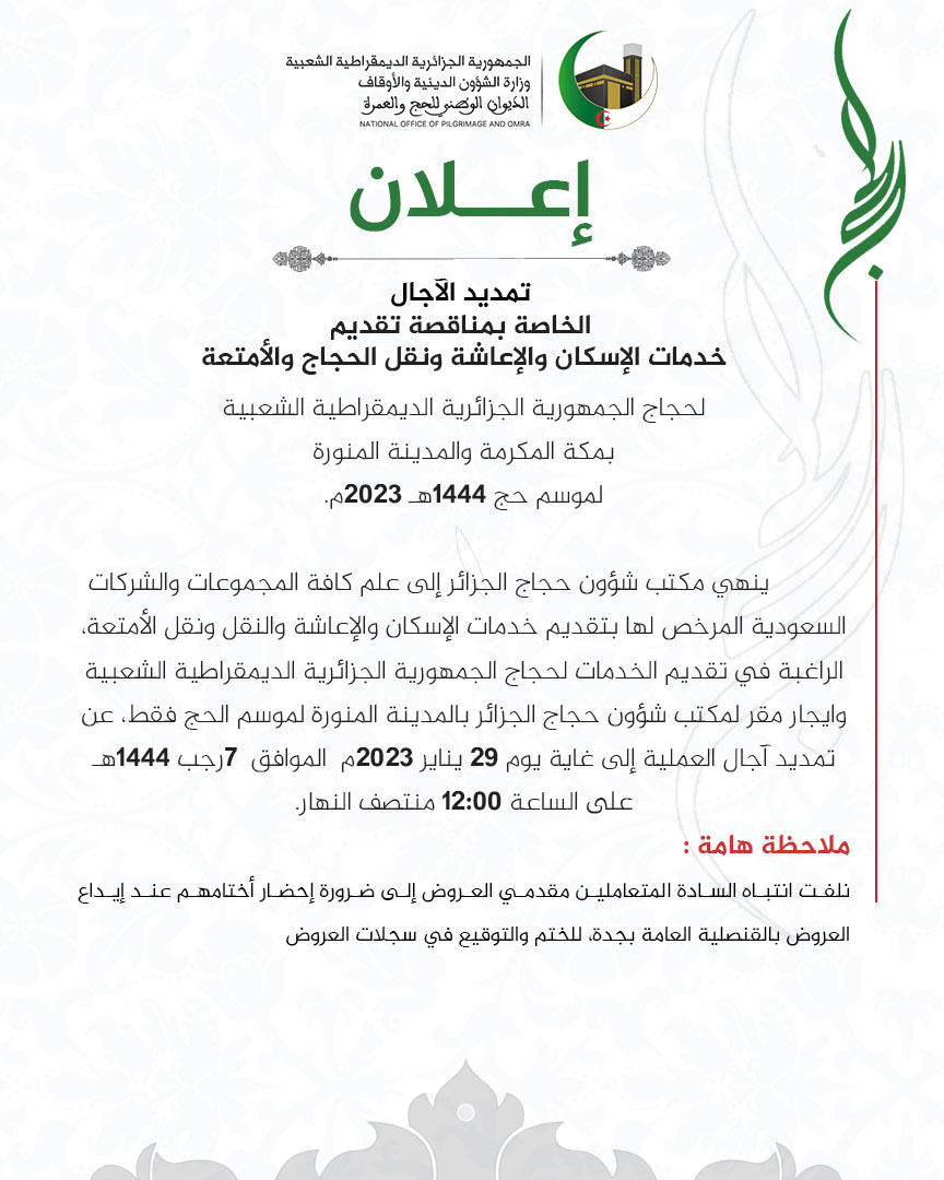 أعلن الديوان الوطني للحج والعمرة عن تمديد جديد للآجال مناقصة تقديم خدمات الحجاج الجزائريين لموسم الحج 2023 إلى غاية 29 جانفي الجاري.